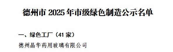 2025年5月,德州晶华药用玻璃有限公司成功获评德州市2025年度市级“绿色工厂”。